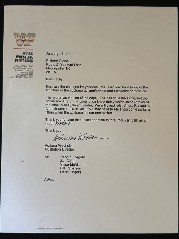 This original set includes two hand-drawn concept mock-ups illustrating the front and back design of his updated ring attire — paired with an official letter from the WWF Illustration Director, Adriana Wechsler, dated January 16, 1991. The correspondence, also cc’d to Vince McMahon, Pat Patterson, and J.J. Dillon, details design revisions and color considerations for Steamboat’s signature cape.